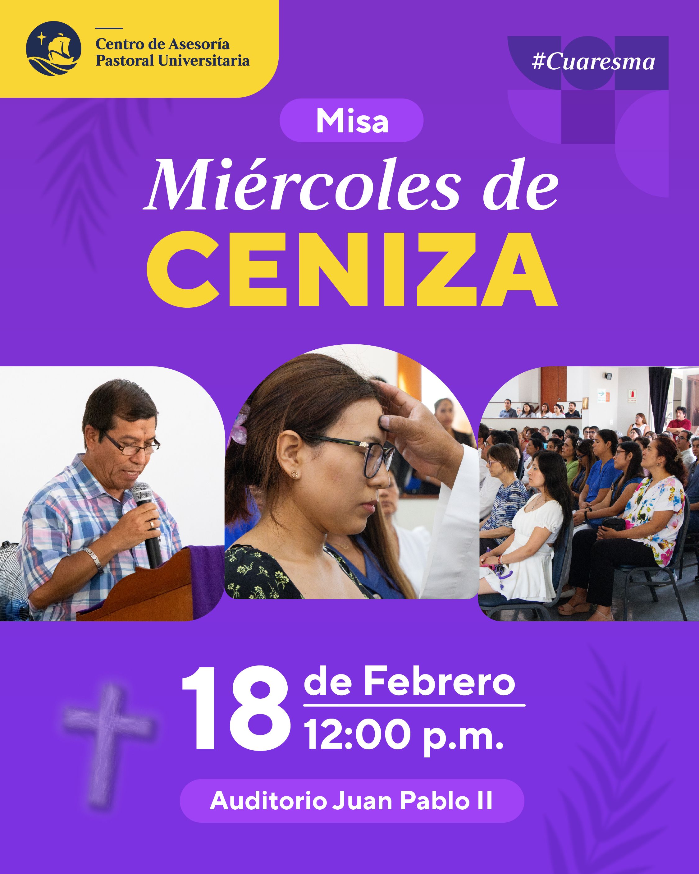 Invitamos a toda la comunidad universitaria a la misa por Miércoles de Ceniza que da inicio al Tiempo de Cuaresma este año. La misa será el miércoles 18 de febrero a las 12 p.m. en nuestro Auditorio Juan Pablo II. Contamos con su valiosa asistencia.